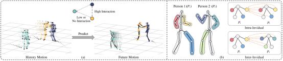图5. (a) 复杂场景下的多人运动交互,其交互程度有高有低。(b) 关于身体部位交互的建模思路。