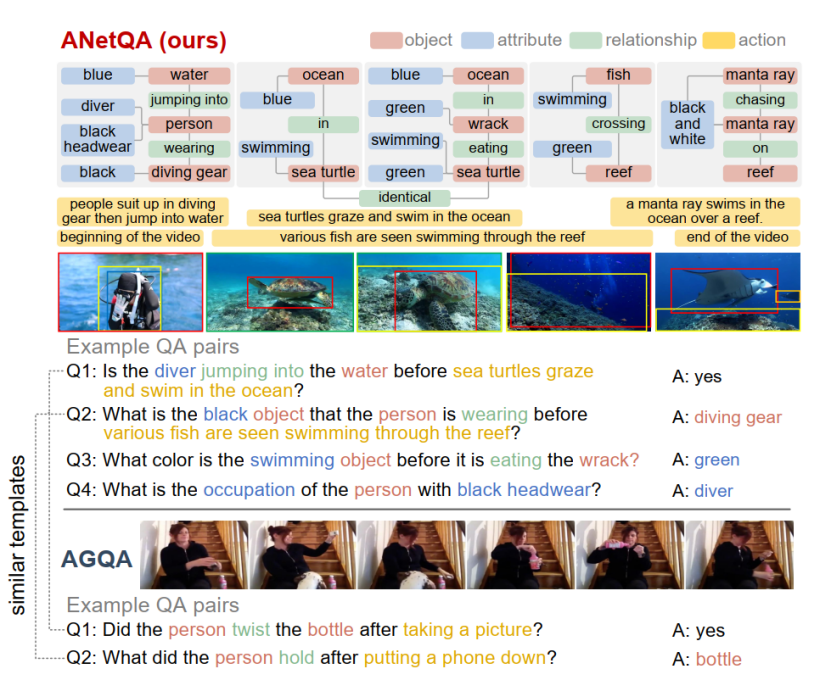 论文"ANetQA: A Large-scale Benchmark for Fine-grained Compositional Reasoning over Untrimmed Videos"构建了目前最大的面向复杂长视频的问答数据集,通过人工标注“细粒度”视频场景图,在1万个长视频上自动生成了14亿问答样本,过滤平衡后最终形成1300万样本,比现有最大的视频问答数据集(斯坦福大学的AGQA)大一个数量级,在问答细粒度方面优势明显。论文第一作者为余宙教授,通讯作者为俞俊教授,硕士研究生郑力祥同学参与了本文的主要工作。